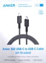 The image shows the packaging of an Anker 322 USB-C to USB-C cable (6ft Braided). It highlights key features such as 60W max charging, superior durability, and safe charging. The cable is compatible with USB-C phones, tablets, and laptops. It is part of Anker’s Series 3 and is advertised as a high-quality mobile charging accessory.