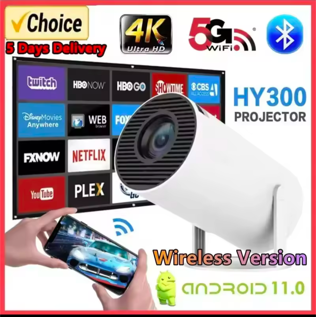 The HY300 Android projector is a compact and portable smart projector with built-in Android OS, allowing direct access to apps like YouTube and Netflix. It offers HD resolution, Wi-Fi and Bluetooth connectivity, and supports screen mirroring. With a bright LED lamp and built-in speakers, it delivers a cinematic experience for home entertainment and presentations.