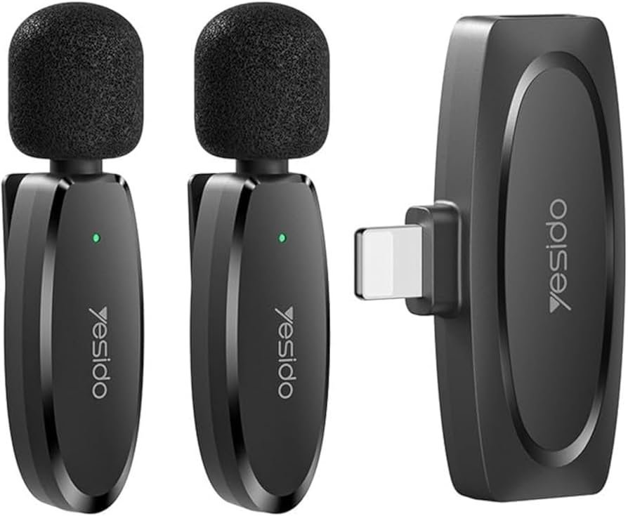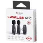 This is a Yesido KR13 Lavalier Microphone set, featuring AI noise reduction and 2.4GHz wireless transmission. The package includes two clip-on microphones and a receiver, designed for automatic pairing and plug-and-play functionality. It offers up to 20 meters of wireless transmission, making it ideal for content creators, vloggers, and professionals who need high-quality audio recording.