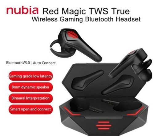 Nubia Red Magic TWS is a true wireless gaming Bluetooth headset featuring Bluetooth 5.0, low-latency performance, 8mm dynamic speakers, binaural interpretation, and smart open-and-connect functionality. Designed for gamers, it offers an immersive audio experience with a futuristic design and a charging case.