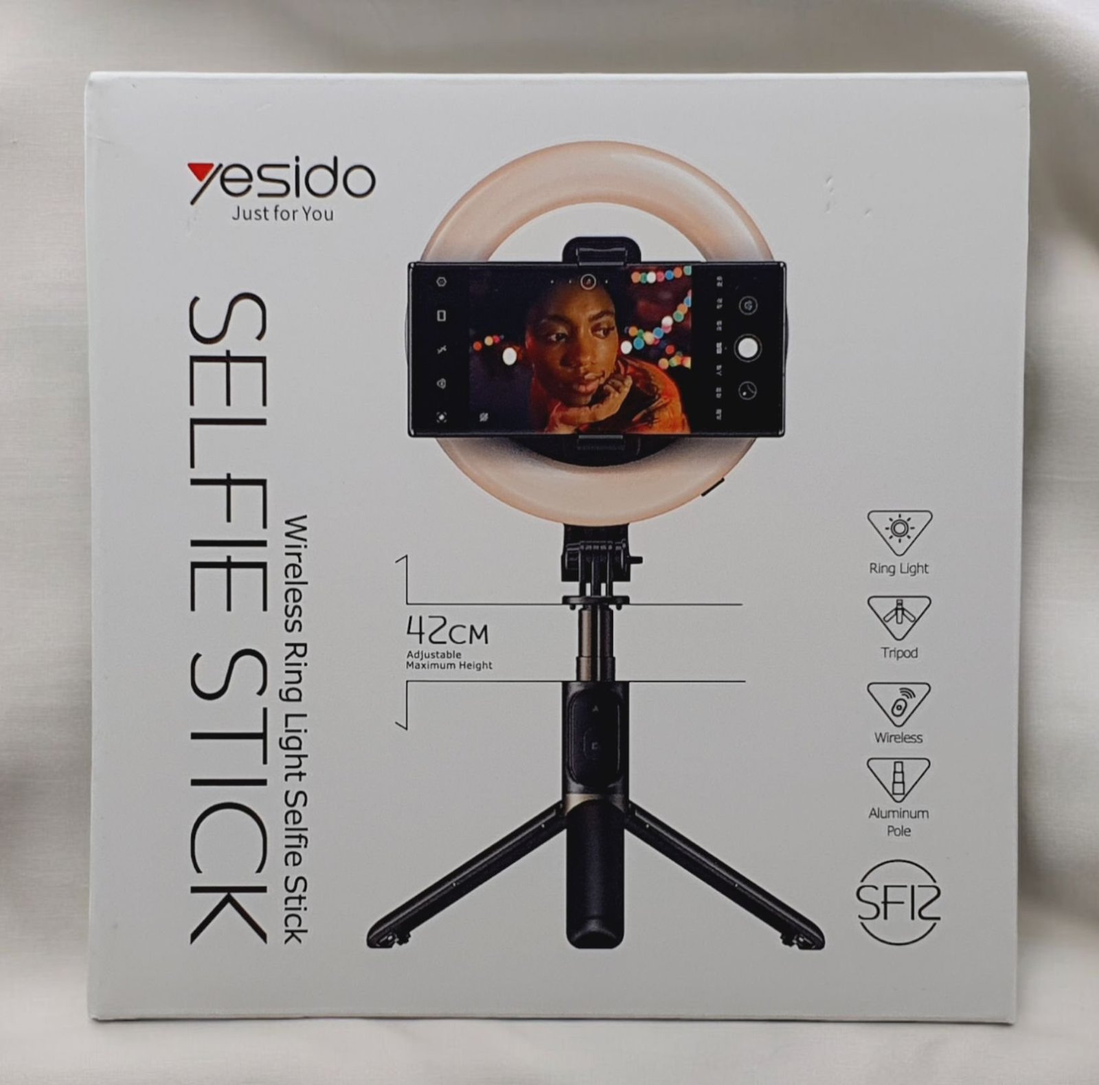 The image shows the packaging of a Yesido SF12 Wireless Ring Light Selfie Stick. The box highlights key features, including: