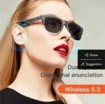 The overall design suggests that these smart sunglasses incorporate Bluetooth connectivity, touch controls, and possibly built-in speakers or microphones for a hands-free experience.