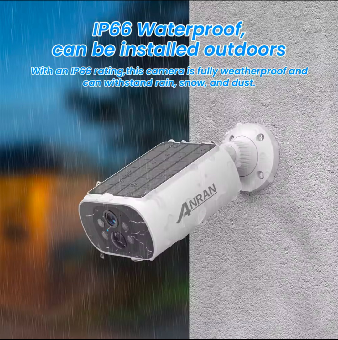 The image shows a security camera mounted on a wall, designed for outdoor use. It has an IP66 waterproof rating, making it resistant to rain, snow, and dust. The camera features a solar panel on top for power and is branded “ANRAN.” The text highlights its weatherproof capability, ensuring durability in harsh conditions.