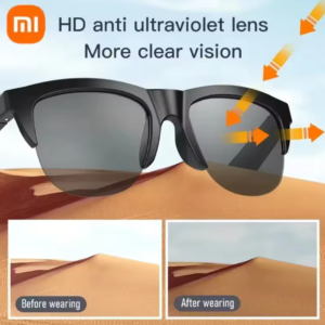 The image showcases a pair of smart sunglasses with a touch-sensitive control feature. The sunglasses have a sleek black frame,